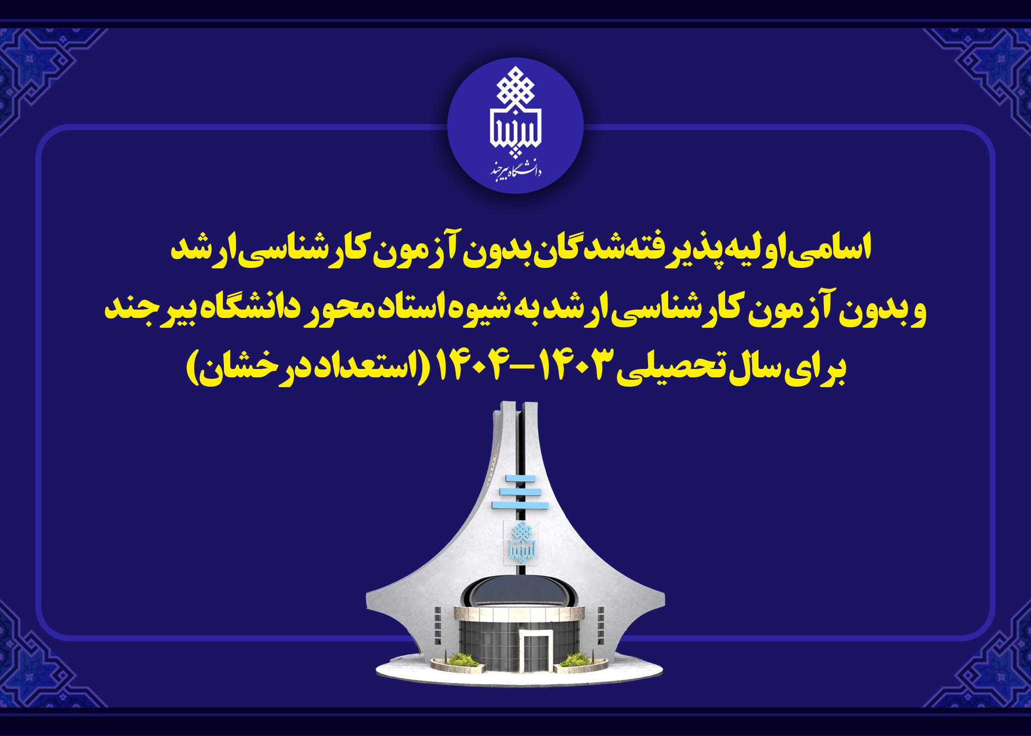 اسامی اولیه پذیرفتهشدگان بدون آزمون کارشناسی ارشد و بدون آزمون کارشناسی ارشد به شیوه استاد محور دانشگاه بیرجند برای سال تحصیلی ۱۴۰۳-۱۴۰۴ (استعداد درخشان)