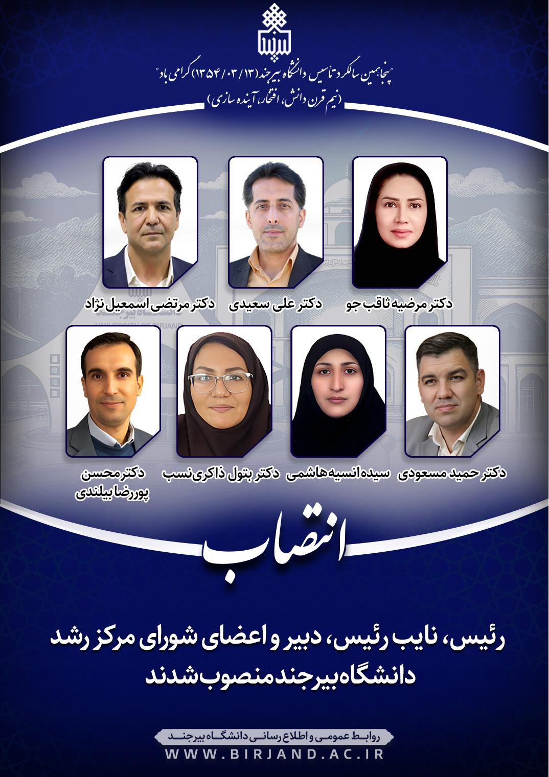 به موجب ابلاغ‌های صادره از سوی دکتر احمد خامسان، سرپرست دانشگاه بیرجند، رئیس، نائب رئیس، دبیر و اعضای حقوقی و حقیقی شورای مرکز رشد دانشگاه بیرجند به مدت دو سال منصوب شدند.