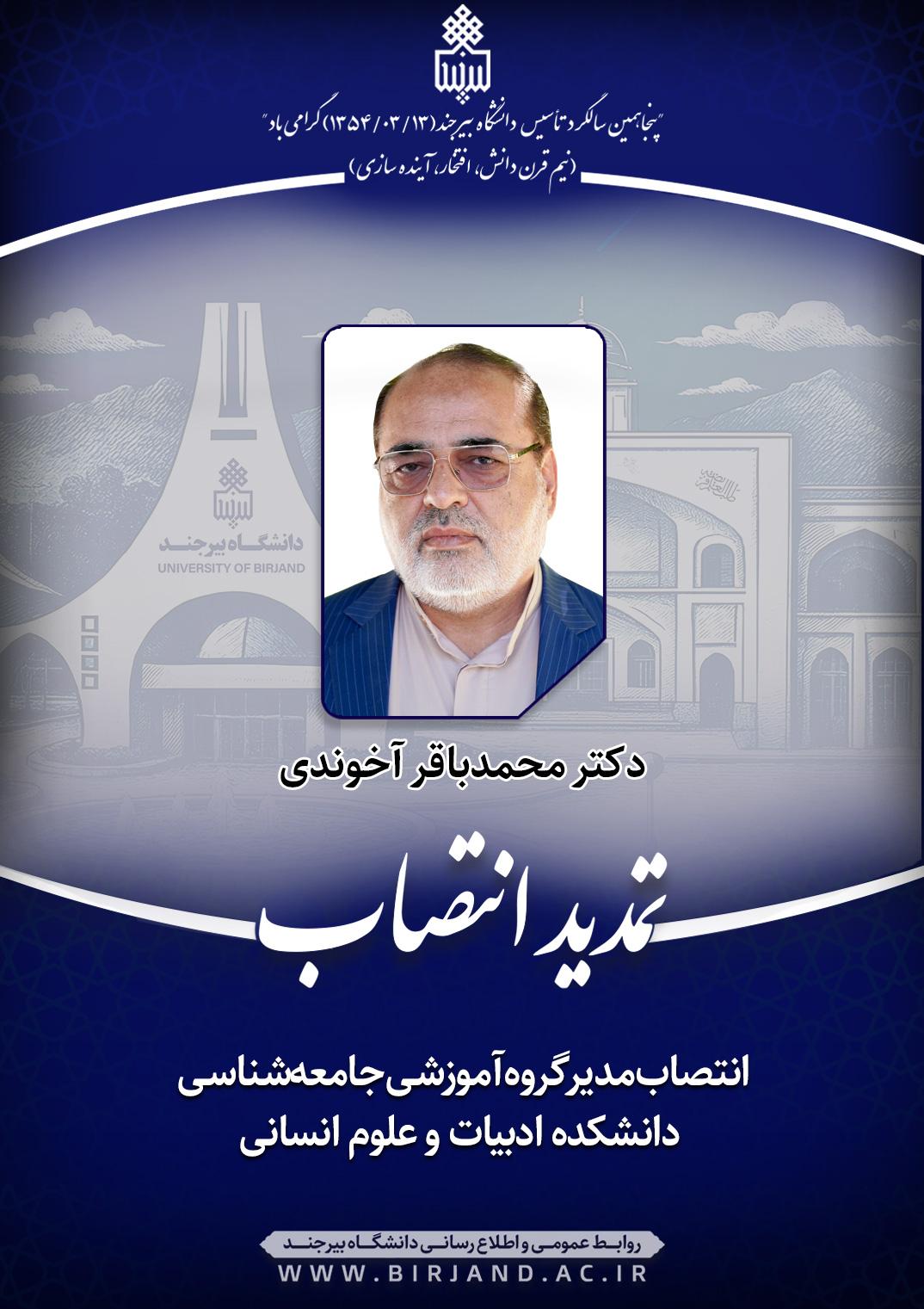 براساس ابلاغی، دکتر احمد خامسان، سرپرست دانشگاه بیرجند، دکتر محمد باقر آخوندی، عضو هیأت علمی گروه آموزشی جامعه شناسی را به سمت مدیرگروه آموزشی جامعه‌شناسی دانشکده ادبیات و علوم انسانی به مدت دو سال منصوب کرد.