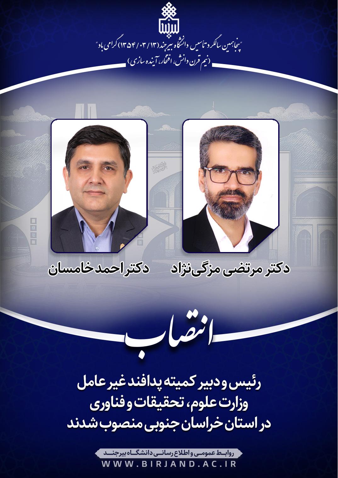 براساس احکام جداگانه‌ای از سوی دکتر اصغر بیات، رئیس کمیته پدافند غیر عامل وزارت علوم تحقیقات و فناوری، دکتر احمد خامسان سرپرست دانشگاه بیرجند به عنوان رئیس کمیته پدافند غیرعامل وزارت علوم در استان خراسان جنوبی و دکتر مرتضی مزگی‌نژاد، مدیر حراست نیز به عنوان دبیر این کمیته منصوب شدند.