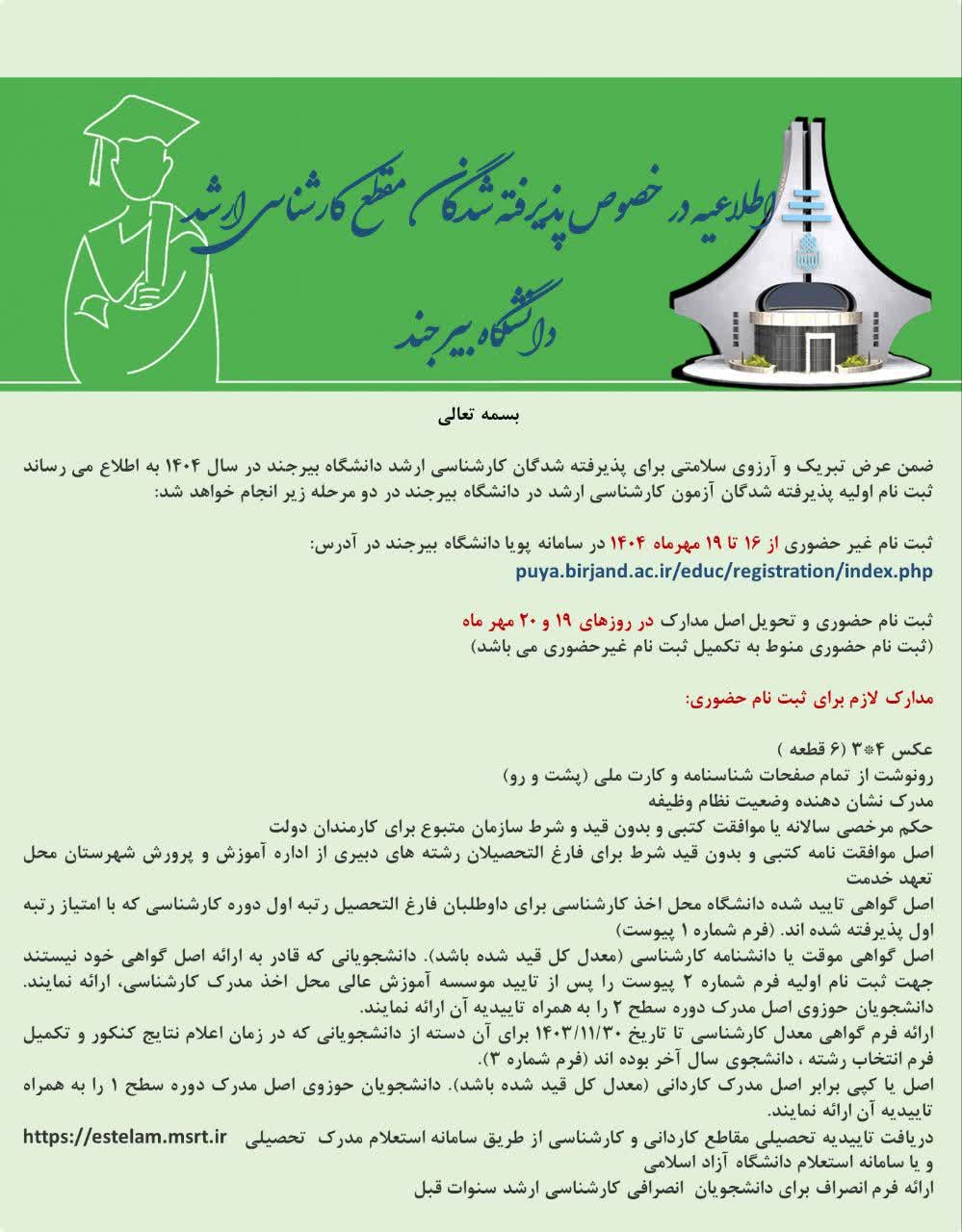 اطلاعیه در خصوص پذیرفته شدگان مقطع کارشناسی ارشد دانشگاه بیرجند ۱۵ مهر ۱۴۰۴ | ۱۳:۰۰ کد : ۳۲۰۲۸ اطلاعیه ها اطلاعیه های مهم ارسال به دیگران نام شما ایمیل شما ایمیل دریافتکننده ارسال انصراف تعداد بازدید:۹۱۳ ضمن تبریک به پذیرفته شدگان کارشناسی ارشد دانشگاه بیرجند در سال ۱۴۰۴ برای اطلاع از فرایند ثبت نام تصویر را مطالعه فرمایید.