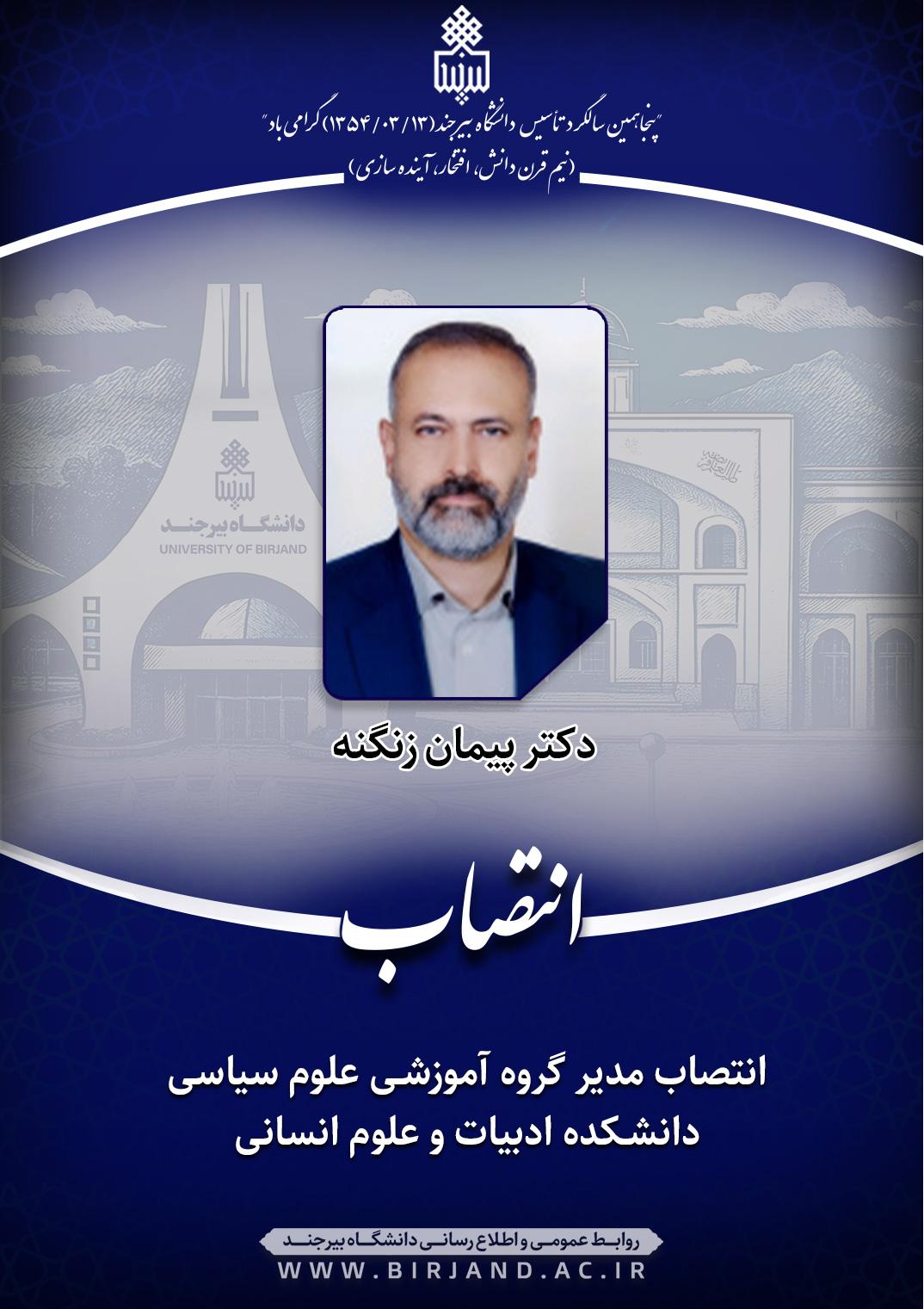 به گزارش روابط عمومی و اطلاعرسانی دانشگاه بیرجند، در ابلاغ صادره از سوی سرپرست دانشگاه به دکتر زنگنه آمده است؛ نظر به مراتب تعهد، تجارب و شایسـتگیهای علمی و اجرایی جنابعالی به پیشنهاد رئیس محترم دانشکده ادبیات و علوم انسانی به موجب این ابلاغ و با حفظ سمت آموزشی و پژوهشی، به سمت مدیر گروه آموزشی علوم سیاسی به مدت دو سال منصوب میشوید. انتظار دارد علاوه بر تـوجه به دسـتورالعملهـا و شرح وظایف مدیران گروههای آموزشی مندرج در آئیننامهها و دستورالعملهای وزارتی و داخلی دانشگاه، به آییننامۀ جامع مدیریت دانشگاهها و مؤسسات آموزش عالی، پژوهشی و فناوری، رئوس انتظارات دانشگاه، (براساس شرح وظایف سازمانی، مصوبات هیآت نظارت، ارزیابی و تضمین کیفیت و سند چشمانداز) دستورالعمل میزان و نحوه حضور و فعالیت اعضای هیأت علمی دانشگاه در طرحهای تمام وقت عادی و ویژه توجه شود.