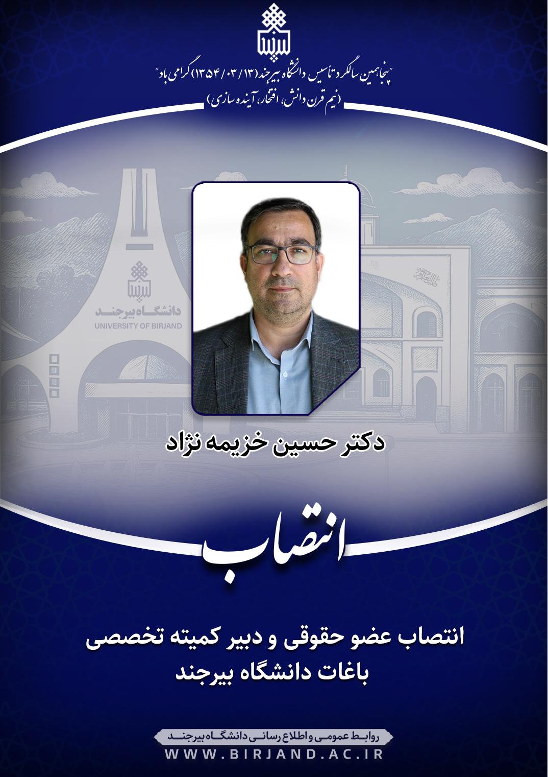 با صدور ابلاغی، از سوی دکتر احمد خامسان، سرپرست دانشگاه بیرجند، دکتر حسین خزیمه‌نژاد، رئیس پردیس کشاورزی، منابع طبیعی و محیط زیست دانشگاه بیرجند به‌عنوان عضو حقوقی و دبیر کمیته تخصصی باغات منصوب شد.