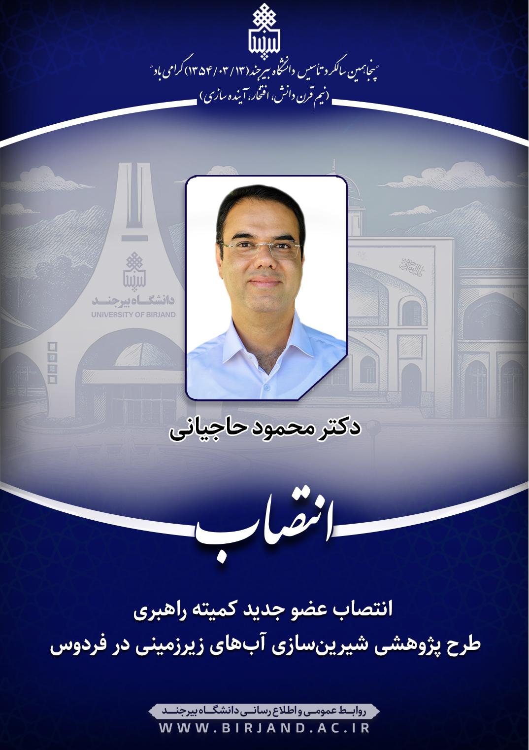به گزارش روابط عمومی و اطلاعرسانی دانشگاه بیرجند، طی حکمی از سوی مهندس عباس سارانی، رئیس هیئت مدیره و مدیرعامل شرکت آب منطقهای خراسان جنوبی، دکتر محمود حاجیانی به عضویت کمیته راهبری پروژه پژوهشی «تعیین روش بهینه شیرینسازی آبهای زیرزمینی نامتعارف به منظور تأمین آب شرب مطالعه موردی شهرستان فردوس» منصوب گردید.
