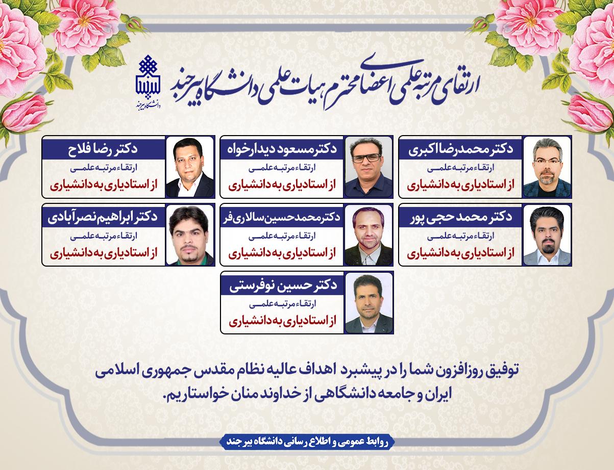 روابط عمومی و اطلاع‌رسانی دانشگاه بیرجند ضمن تبریک به جامعه دانشگاهی، از خداوند متعال برای این اساتید محترم و فرهیخته آرزوی توفیق روز افزون و تداوم موفقیت‌ها در کسب درجات علمی بالاتر را خواستار است.